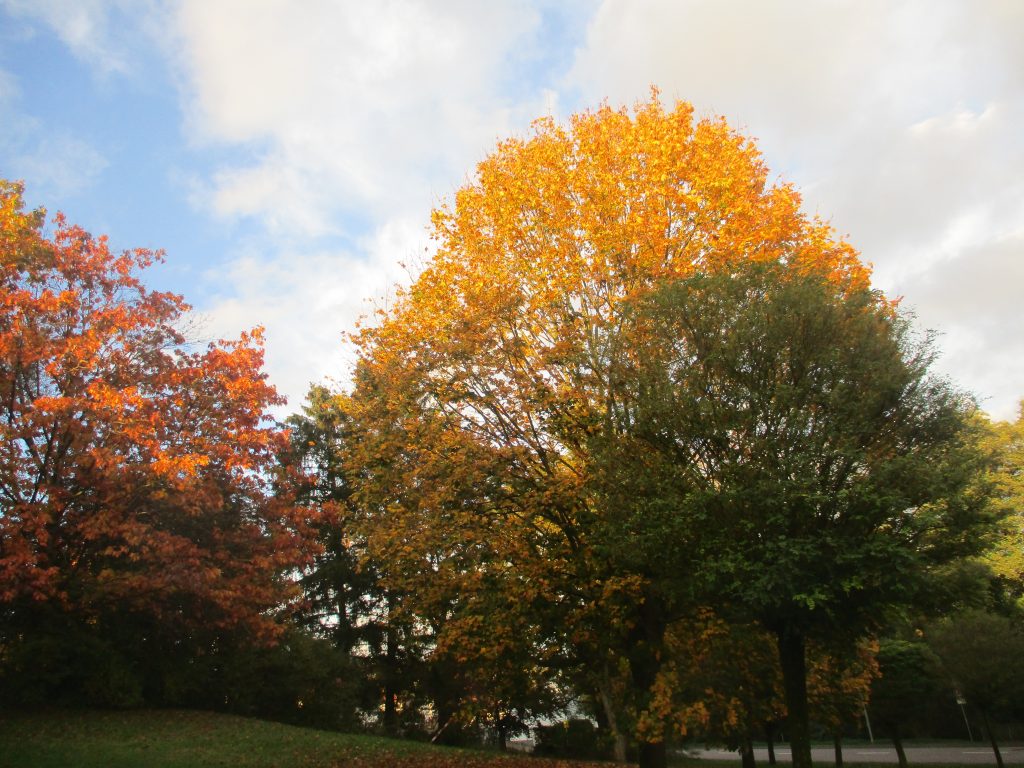 Nach den trüben Tagen im bisher sonnenscheinarmen Oktober dürfen wir am Wochenende mit sonnigen Phasen wenigstens einen kurzes Hauch Goldener Oktober erleben. Die Verfärbung des Laubs in prächtigen Farbttönen wie Gelb, Orange, Rot bis hin zu Braun wird durch die derzeit kürzer werdende Tageslänge ausgelöst. Wenn dann in der kommenden Woche noch windiges Herbstwetter aufkommt, wird der Laubfall beschleunigt.